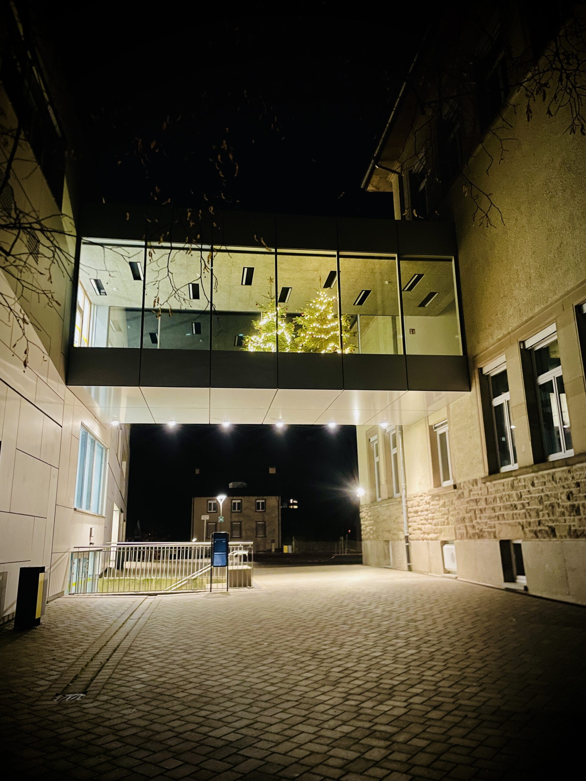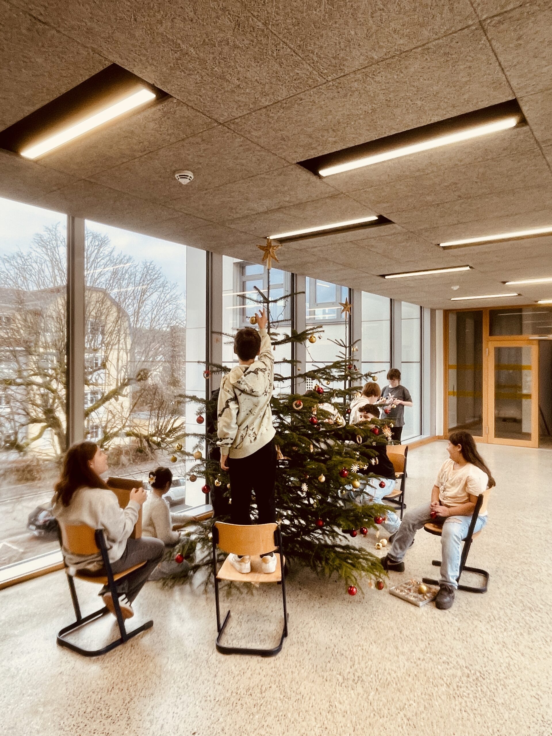 Die Klasse 6B kümmerte sich mit großem Engagement um die Gestaltung der Krippenlandschaft vor dem Rektorat. Dort steht nun auch ein festlich geschmückter Weihnachtsbaum, der den Eingangsbereich in warmes Licht taucht. Im Durchgang zur Johann-Peter-Hebel-Schule sorgen zwei weitere dekorierte Tannenbäume für eine stimmungsvolle Verbindung zwischen beiden Schulen. Und direkt im Eingangsbereich begrüßt ein leuchtender Weihnachtsmann alle Besucherinnen und Besucher schon von weitem.