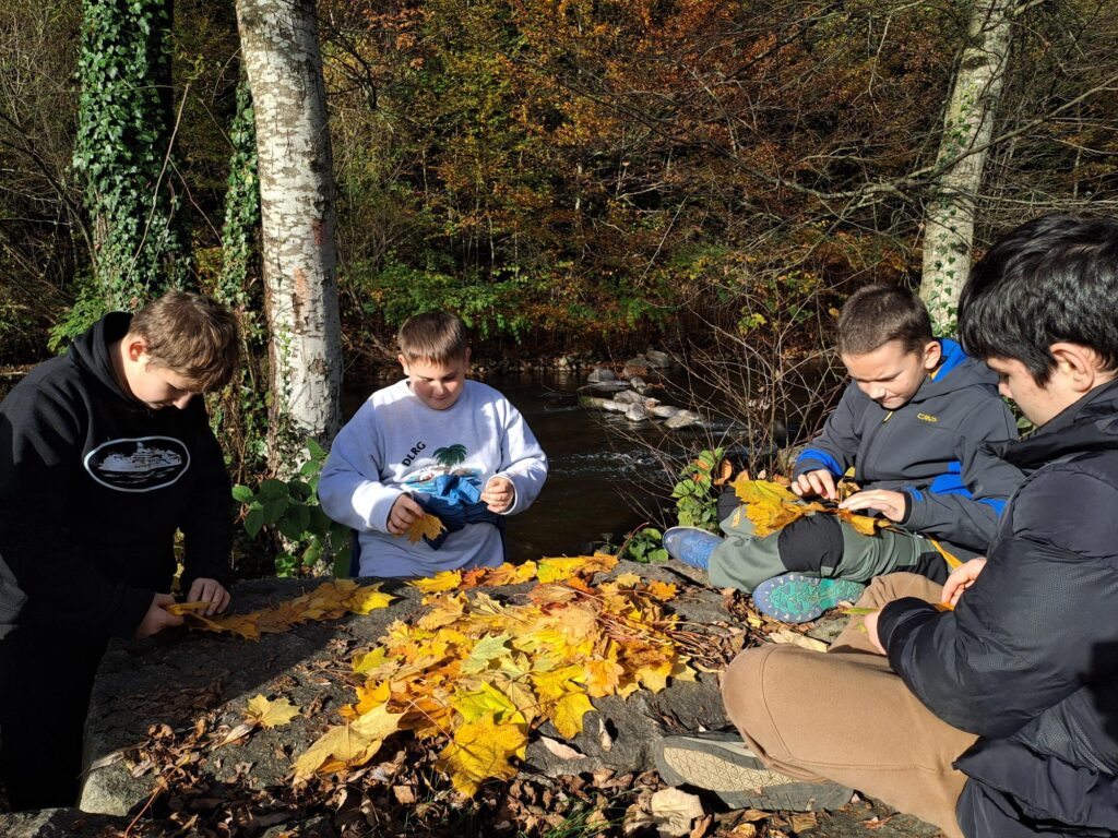 Die „Nix wie raus!“-Gruppe hat die wunderschön verfärbten Ahornblätter vom Schulparkplatz gesammelt und leuchtende Kunstwerke daraus gezaubert. Einige wurden dem Wasser der Wiese übergeben und...
